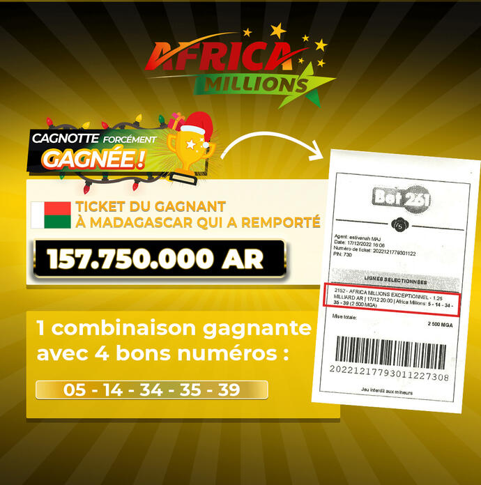 le samedi 17 décembre une joueuse a gagné 157 Millions Ariary pour 2.500 AR